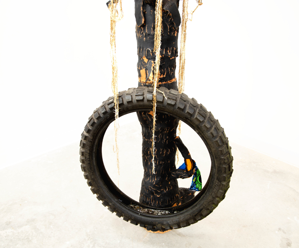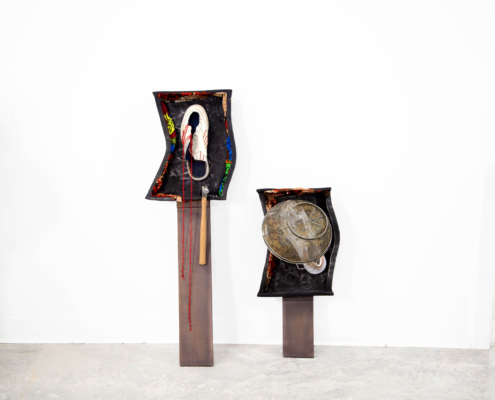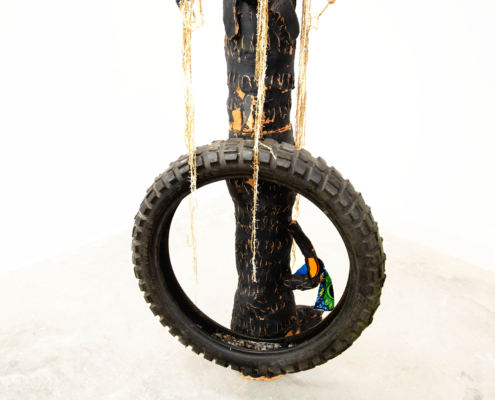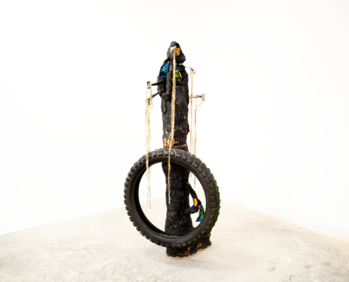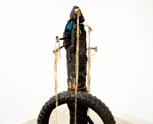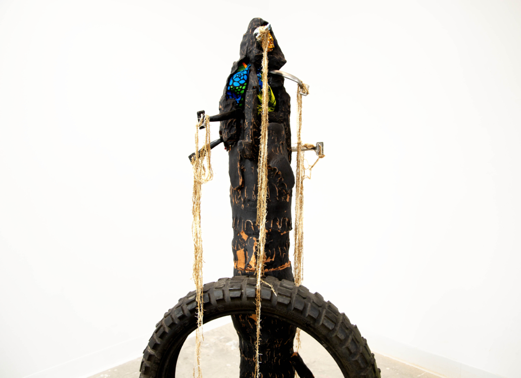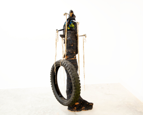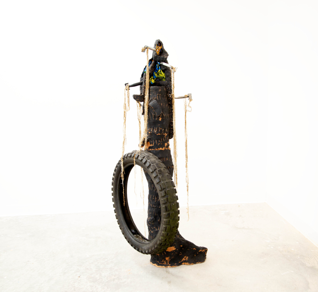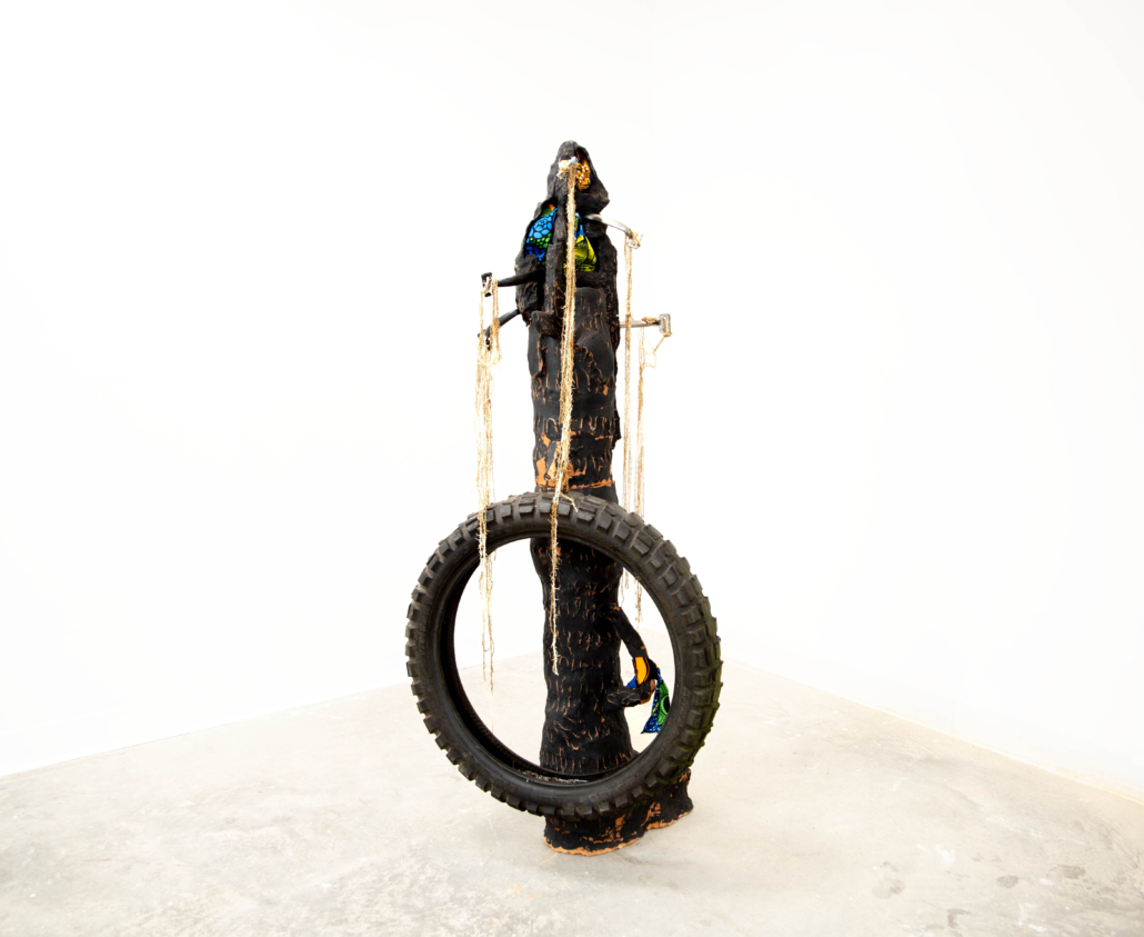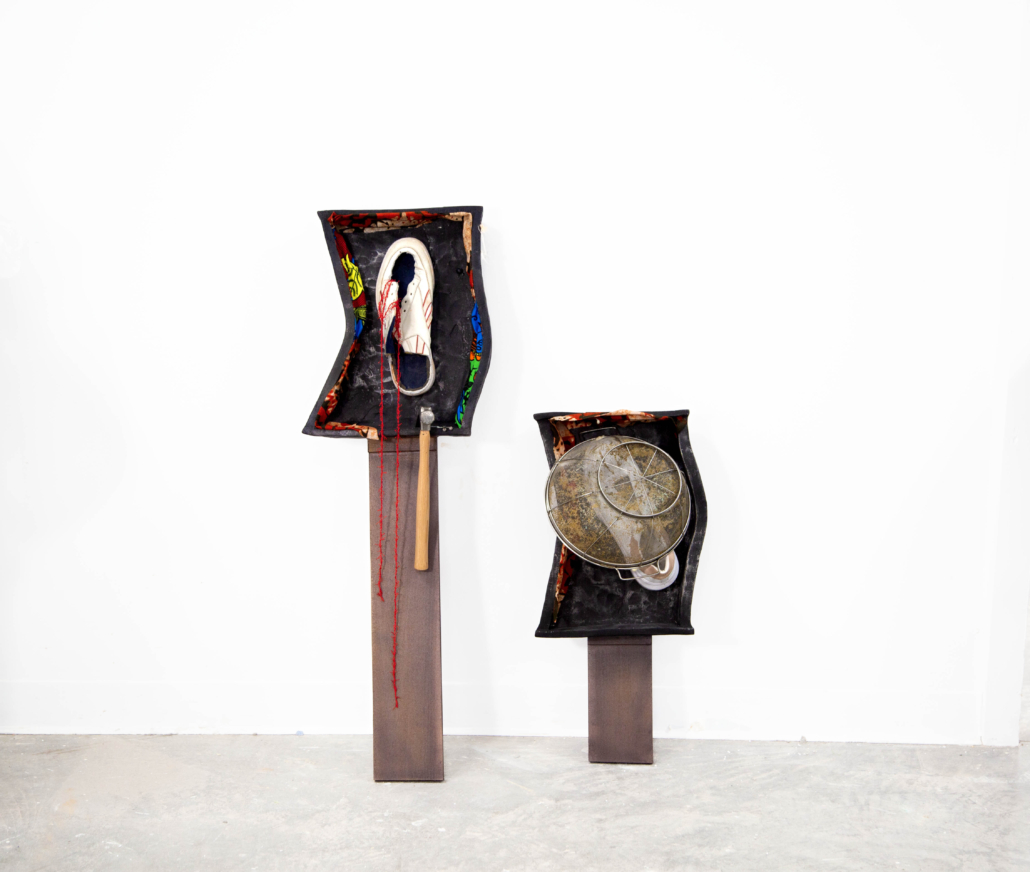 Earthenware clay, underglaze, batik fabric, yarns, wood, found object 40.6″ x 28″ x 10″